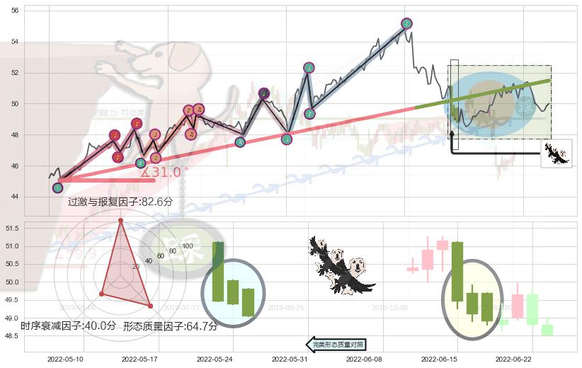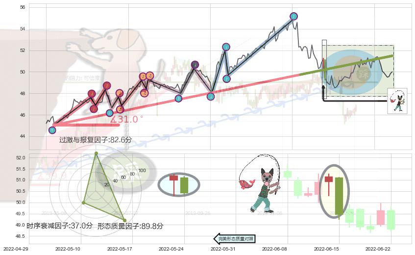 ➢ 2021-10-11-2022-05-24上升趋势存在反转[风险],其原上升趋势的支撑位(51.49)已破位[强阻力信号],原上升趋势角度: 31.0˚