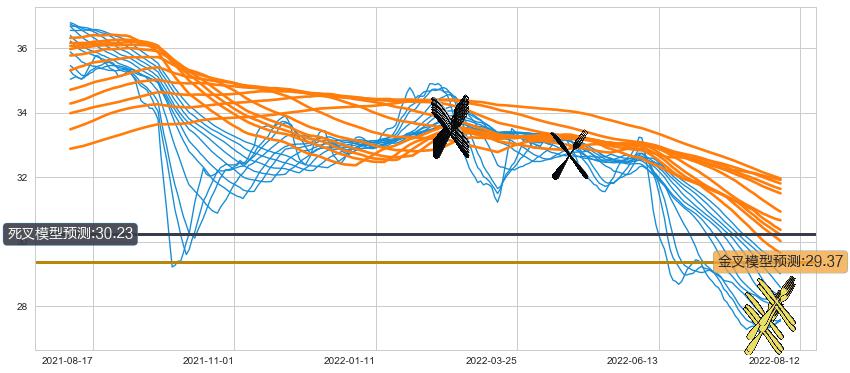 ➣ 85小时均线于(2022-02-21: 33.40)形成【死叉】基于【死叉历史模型】预测死叉后最低波谷价格: 30.16, 死叉后最低价格26.75,已经下跌超出预测最低波谷价格, 预期反弹