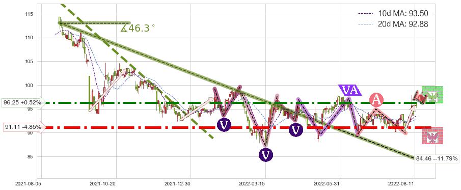 ♘ 支撑价格位91.11,可信任强度93.33%,距离最后交易2022-08-12形成的收盘价格95.75相差 -4.85%