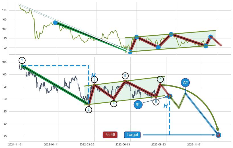 ➣ 升旗形:猜想临近关键支撑位突破点 → 临近拐点下跌 → 风险信号 → 大趋势均值回复