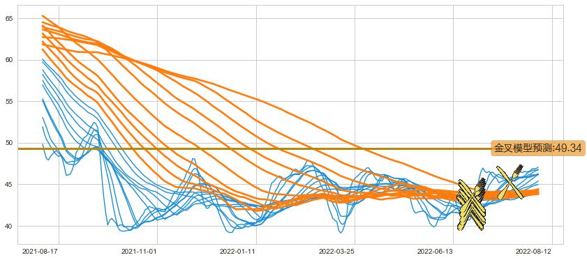 ➣ 80小时均线于(2022-06-24: 43.12)形成【金叉】基于【金叉历史模型】预测金叉后最高波峰价格: 50.28, 金叉后最高价格47.75,尚未达到预测最高波峰价格, 预期继续上涨