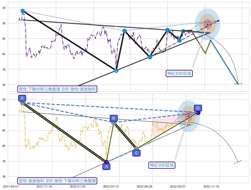 ➢ 下降对称三角整理与谐波伽利信号事件周期长度级别相同,同周期信号事件