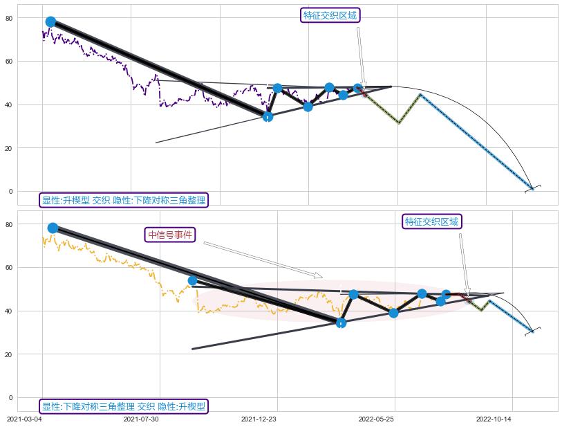 ➢ 下降对称三角整理属【中级别信号事件】升楔型属【长级别信号事件】中长周期组合信号事件,中长事件长度比65.71%