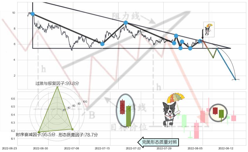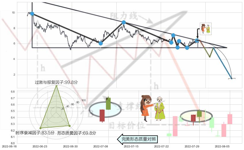 ➢ AI智能: 预测【多空防线逐步靠近→双方接火→空方占优】下降三角形中继整理向下突破,预测将在2022-09-08突破颈线, 演变成下降通道