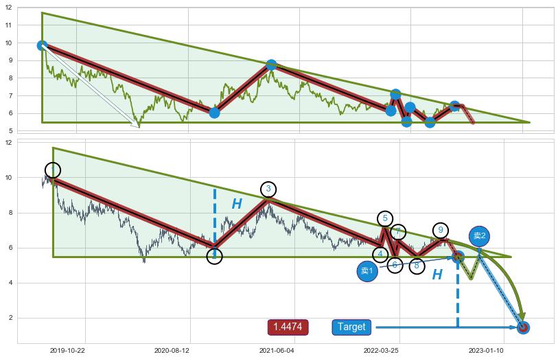 ➣ 升旗形:猜想预期下跌目标target即将达成,随后猜想强支撑来临,预期反弹上涨(均值回复)