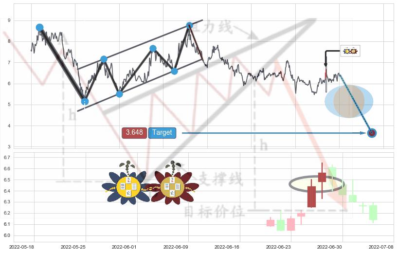 ➢ 收盘价(2022-07-07: 6.08 )→回踩→第一根k线高点(2022-06-24: 6.22 )