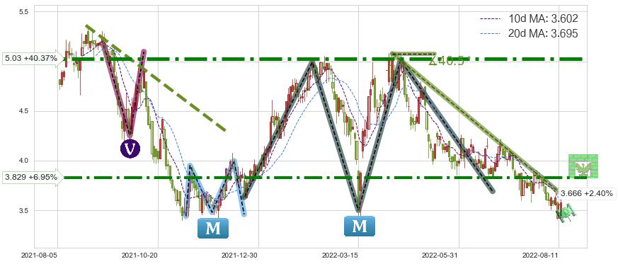 🦴 长线均值回复组合短线趋势跟踪[强阻力信号]2022-04-08-2022-08-12下跌趋势依然成立(下跌趋势跟踪依然存在),短线价格略微上行反弹(均值回复猜想),即将接近下跌趋势提供的未破位阻力价格:3.666。