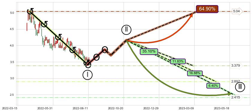 ➣ 循环浪继续向下【平均值】位置(2023-04-21, 2.897),匹配聚类样本比例48.09%, 可能性概率16.88%