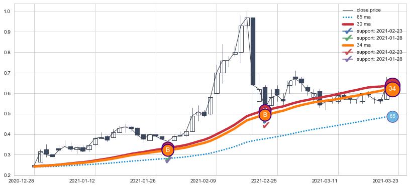 ➣ 65小时均线于(2022-04-01: 0.33431)形成【死叉】基于【死叉历史模型】预测死叉后最低波谷价格: 0.29903, 死叉后最低价格0.27000,已经下跌超出预测最低波谷价格, 预期反弹