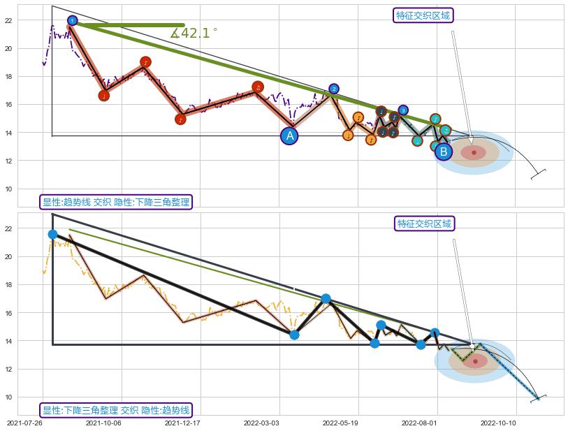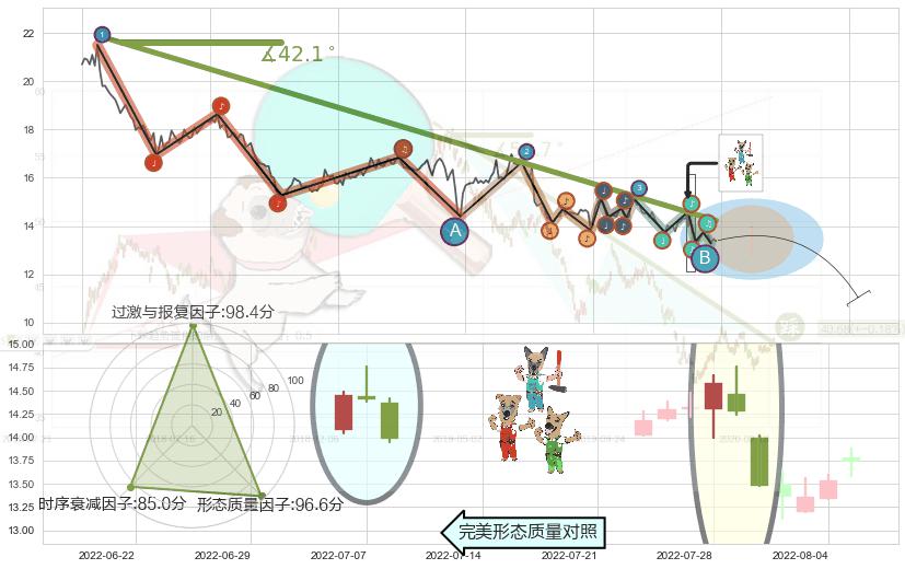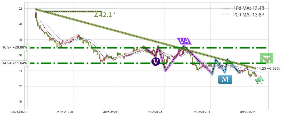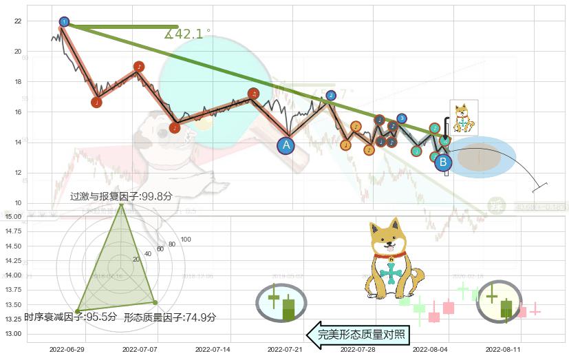 ♘ 在最后的下跌阶段2021-08-18至2022-08-12,存在 持续未破位的阻力位 ,阻力价格14.23,可信任强度87.61%,其距离最后价格13.38相差 +6.36%