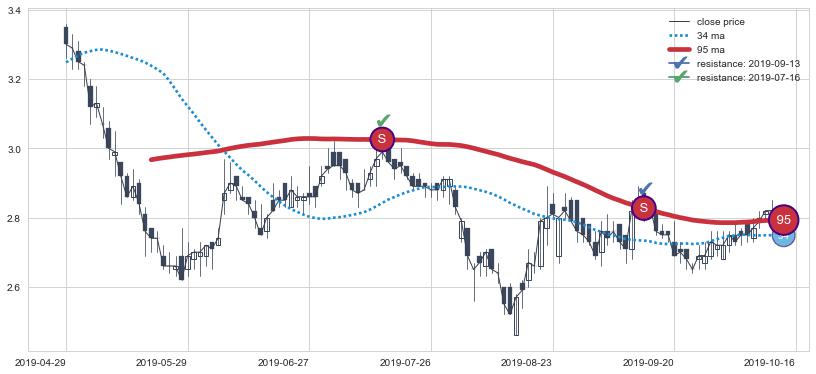 ➢ 最优均线组合共正确确认支撑阻力信号10处,正确确认率 76.92%