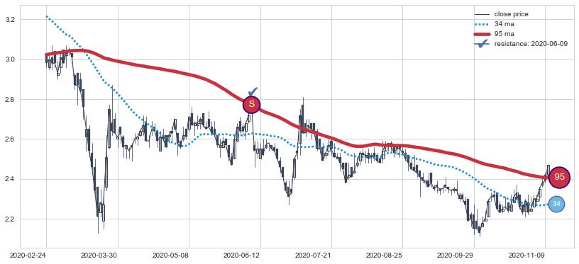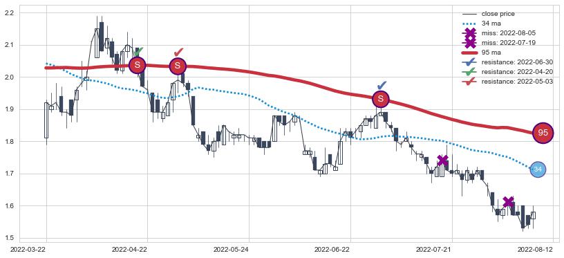 ➢ 34小时均线于(2022-05-05: 1.9515)形成【死叉】基于【死叉历史模型】预测死叉后最低波谷价格: 1.6511, 死叉后最低价格1.5300,已经下跌超出预测最低波谷价格, 预期反弹