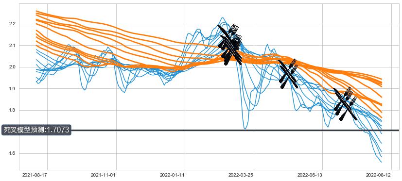 ➢ 10小时均线于(2022-07-04: 1.8480)形成【死叉】基于【死叉历史模型】预测死叉后最低波谷价格: 1.6438, 死叉后最低价格1.5300,已经下跌超出预测最低波谷价格, 预期反弹