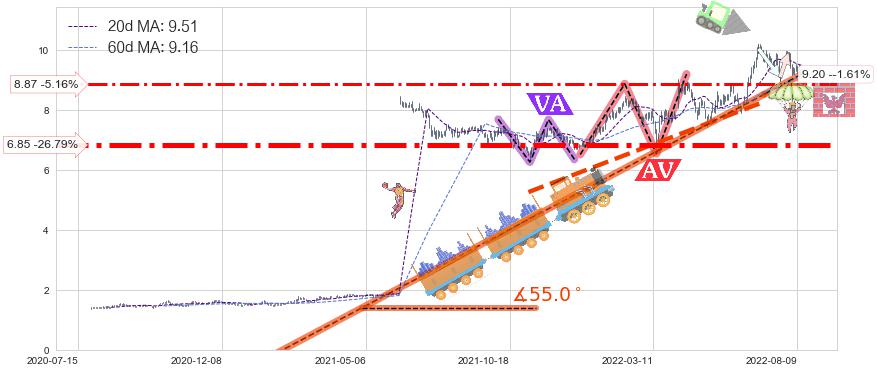 ♘ 支撑价格位6.85,可信任强度88.32%,距离最后交易2022-08-12形成的收盘价格9.35相差 -26.79%