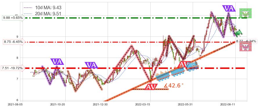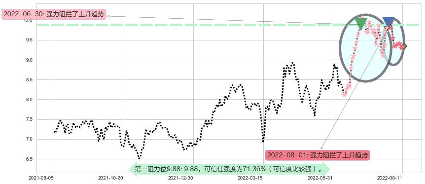 ♘ 阻力价格位9.88,可信任强度71.36%,距离最后交易2022-08-12形成的收盘价格9.35相差 +5.65%