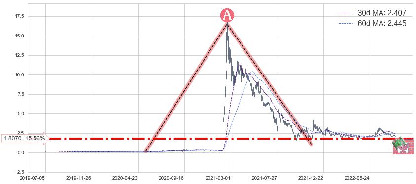 ♘ 支撑价格位1.8070,可信任强度76.45%,距离最后交易2022-08-12形成的收盘价格2.140相差 -15.56%