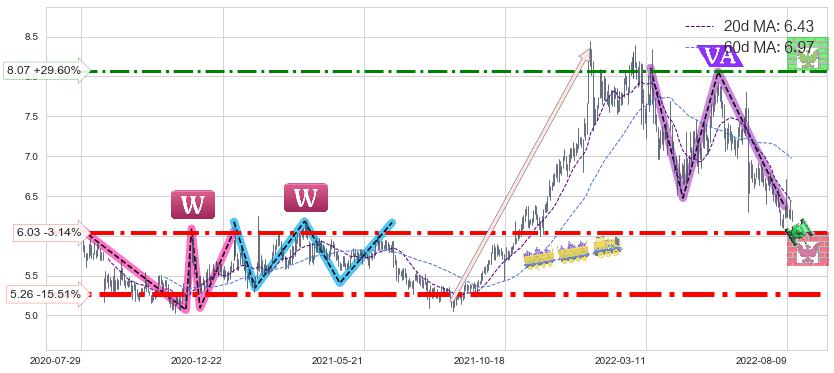♘ 支撑价格位6.03,可信任强度71.07%,距离最后交易2022-08-12形成的收盘价格6.23相差 -3.14%
