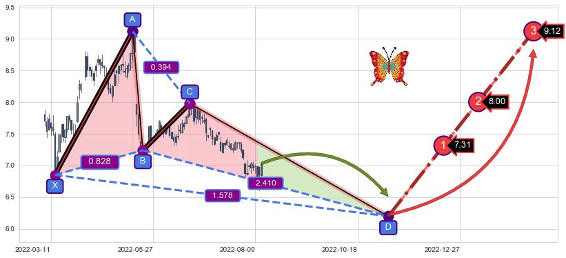 ➢ 距离预测D点位置有足够的下跌空间, 与看涨【蝴蝶】形态相反,实际方向【看跌】