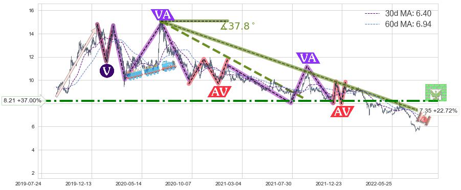 ➢ 【多方力量耗尽,空方打破攻守平衡点】下降三角形中继整理, 已在2022-03-07突破【支撑】颈线 8.30 →演变成下降通道