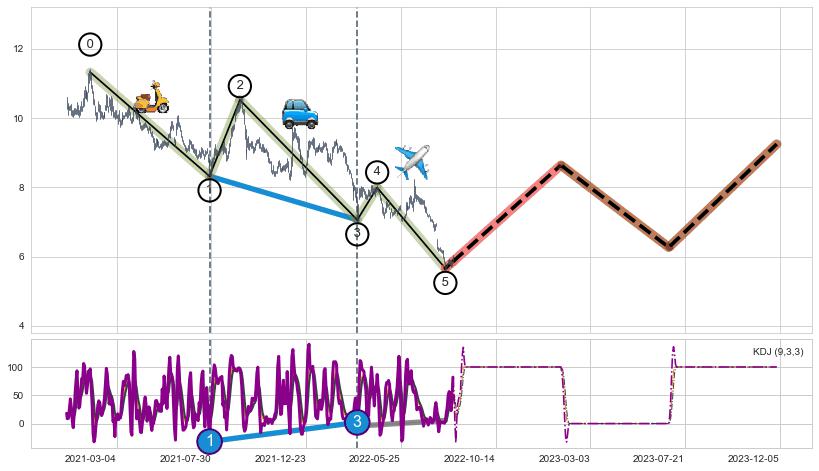 ➢ 第一, 三驱动浪端点:【KDJ】走势出现【常规背离 & 反转信号】背离程度99.00%,背离夹角角度47.8˚,背离程度较大