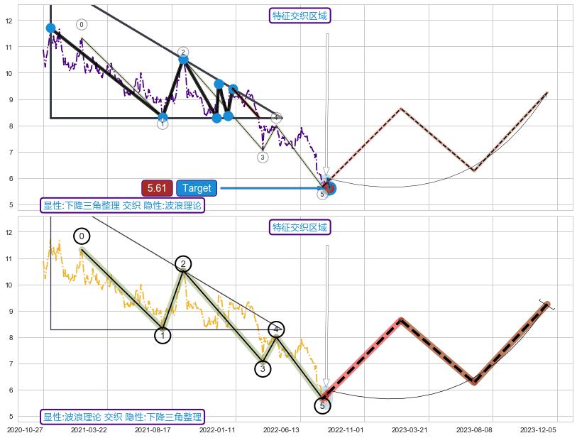 ➢ 波浪理论下跌浪:浪5反弹拐点 🔜 下降三角整理临近target支撑拐点上涨 综合量化分数:54.16 【偏多】