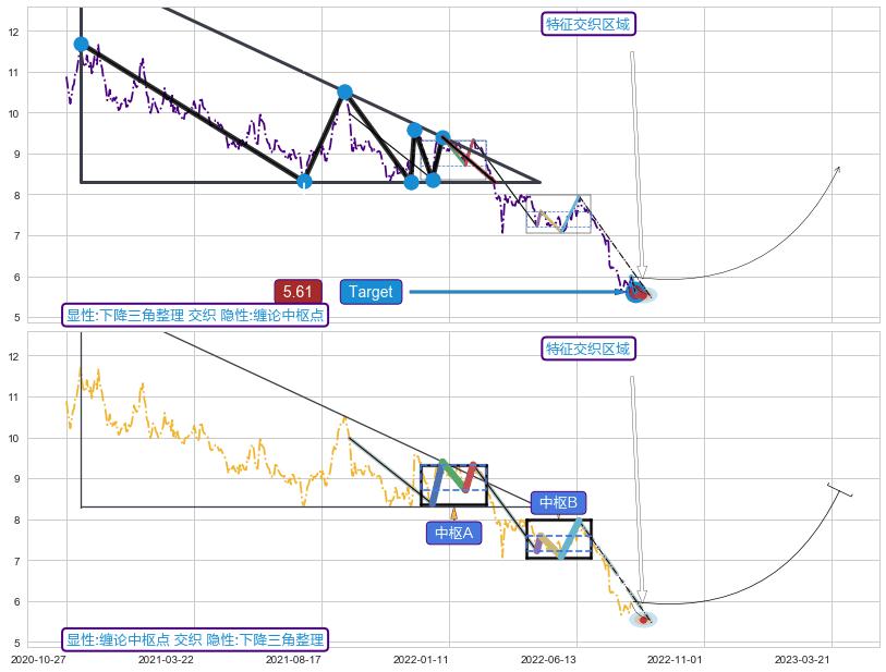 ➣ 【中枢A】:2021-12-22-2022-02-10,中枢由4笔构成,共33交易日, ZG=9.33, ZD=8.71