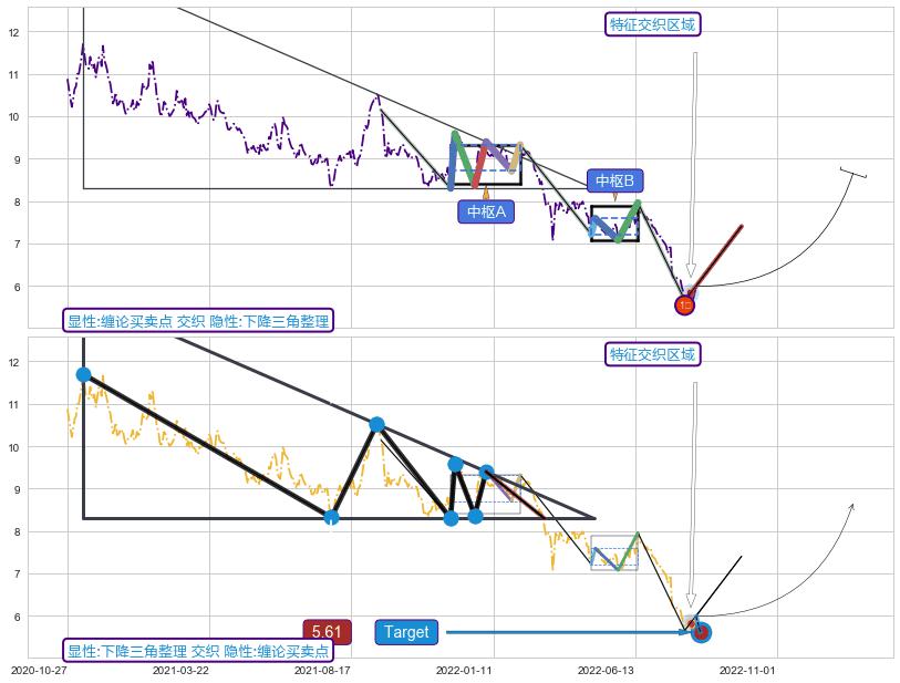➢ 【中枢A】:2021-11-29-2022-02-10,中枢由6笔构成,共50交易日, ZG=9.33, ZD=8.71