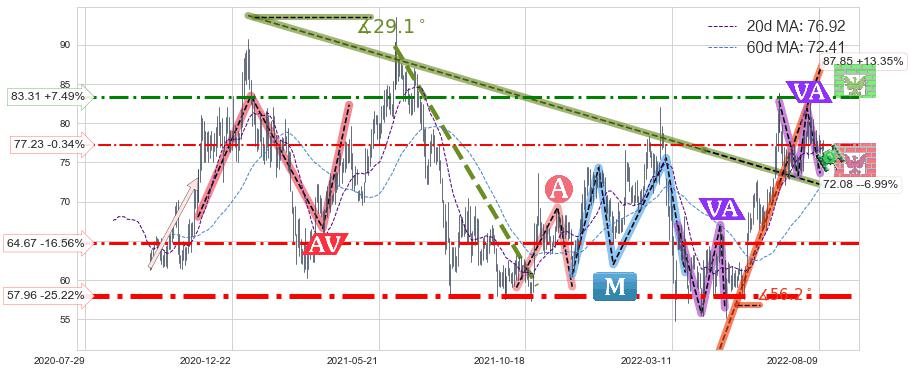 ♘ 支撑价格位77.23,可信任强度38.12%,距离最后交易2022-08-12形成的收盘价格77.50相差 -0.34%