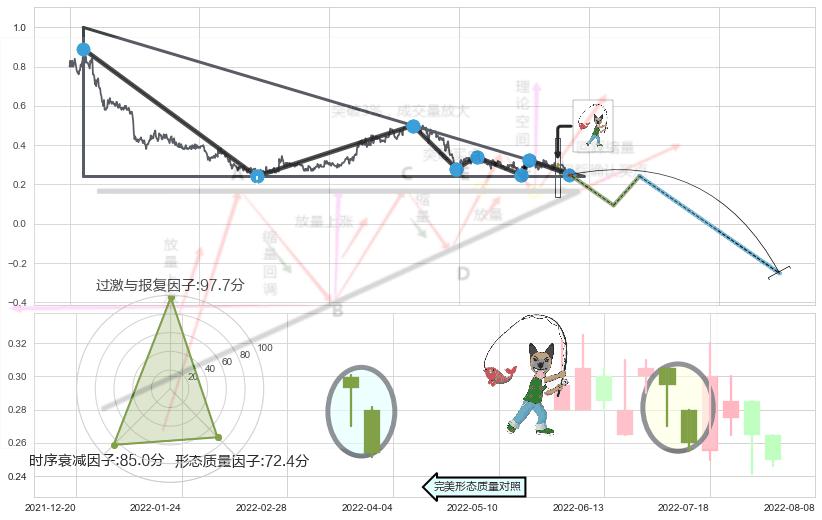 ➢ AI智能: 预测【多空防线逐步靠近→双方接火→空方占优】下降三角形中继整理向下突破,预测将在2022-08-10突破颈线, 演变成下降通道