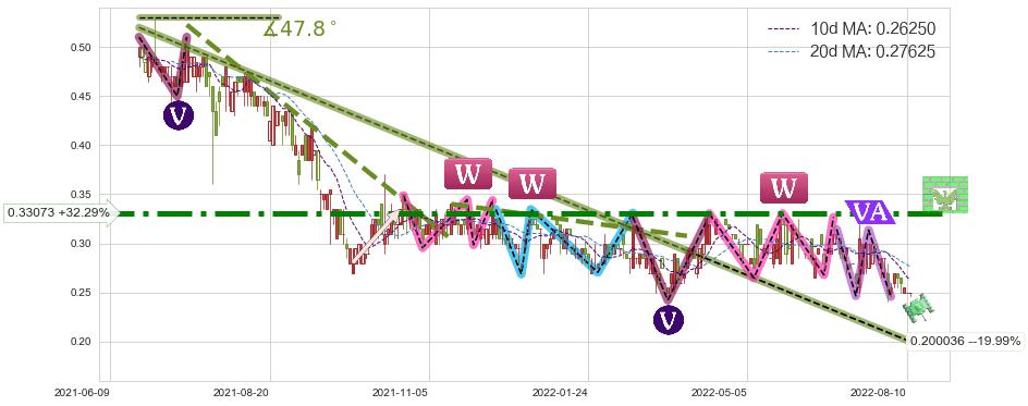 ♘ 阻力价格位0.33073,可信任强度95.12%,距离最后交易2022-08-11形成的收盘价格0.250000相差 +32.29%