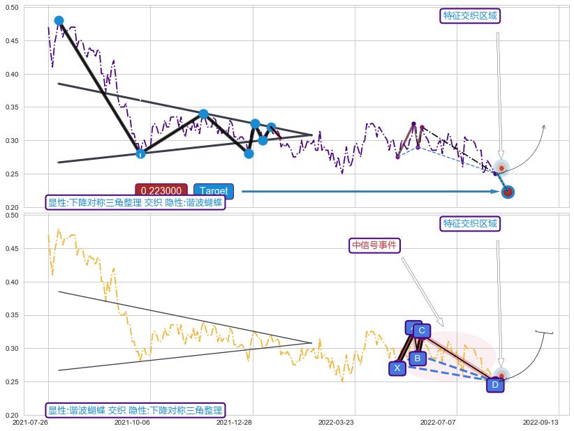 ➢ 下降对称三角整理属【短级别信号事件】谐波蝙蝠属【长级别信号事件】长短周期组合信号事件, 短长事件长度比26.63%