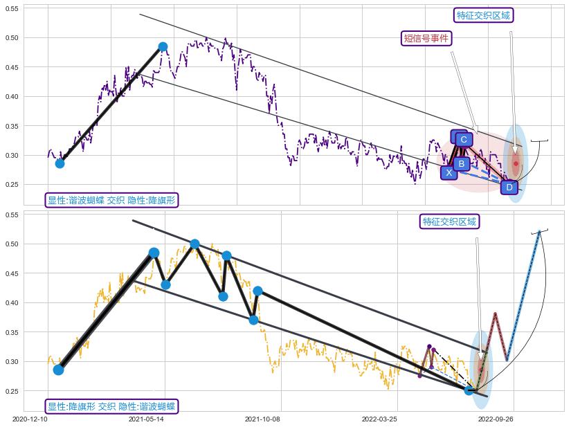 ➢ 谐波蝴蝶属【短级别信号事件】降旗形属【长级别信号事件】长短周期组合信号事件, 短长事件长度比13.61%
