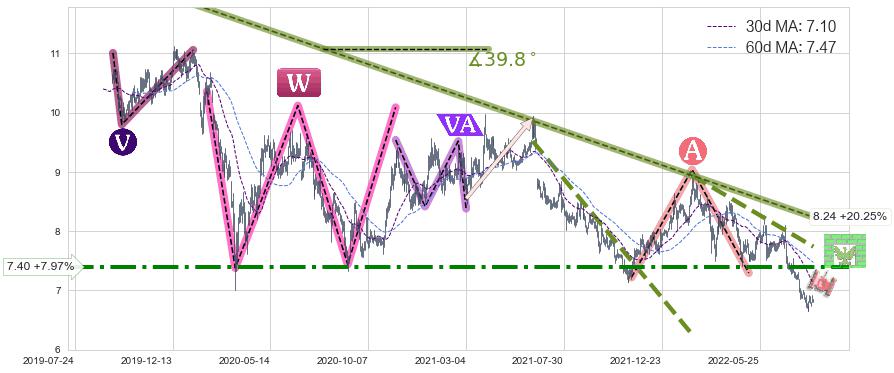 2022-05-10: 第一阻力位7.40有效抑制了下跌浪,成功阻止了价格的继续下跌。