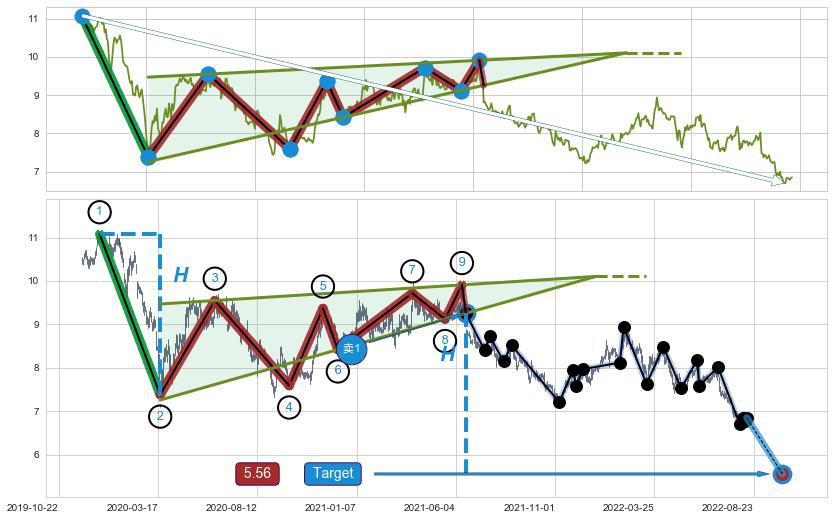 ➣ 升楔型:猜想预期下跌目标target即将达成,随后猜想强支撑来临,预期反弹上涨(均值回复)