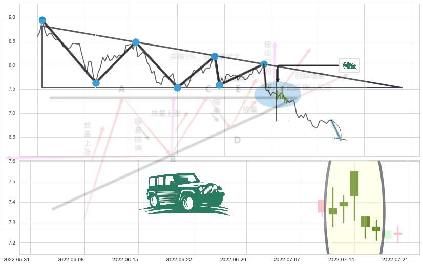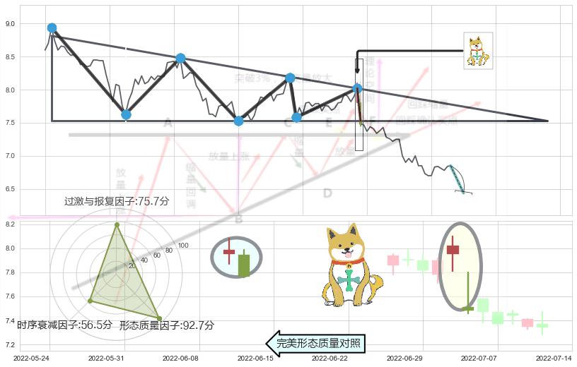 ➢ 【多方力量耗尽,空方打破攻守平衡点】下降三角形中继整理, 已在2022-07-05突破【支撑】颈线 7.53 →演变成下降通道