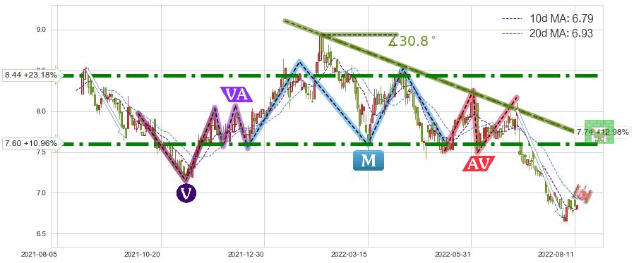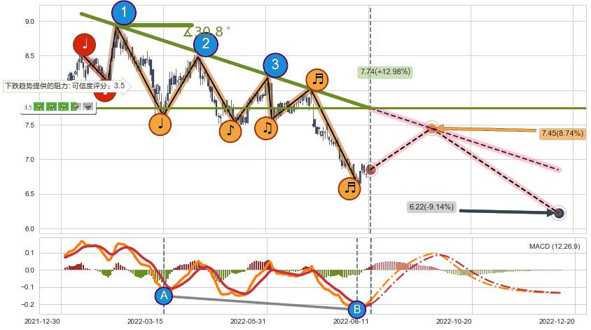 ♘ 阻力价格位7.60,可信任强度90.12%,距离最后交易2022-08-12形成的收盘价格6.85相差 +10.96%