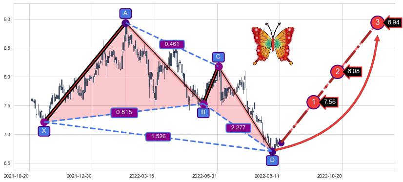 ➢ 谐波蝴蝶:c下跌到达d:猜想拉升 → 上涨 →【拐点】强支撑临近 → 大趋势均值回复