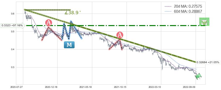 ♘ 在最后的下跌阶段2020-08-03至2022-08-12,存在 持续未破位的阻力位 ,阻力价格0.32684,可信任强度88.47%,其距离最后价格0.27000相差 +21.05%