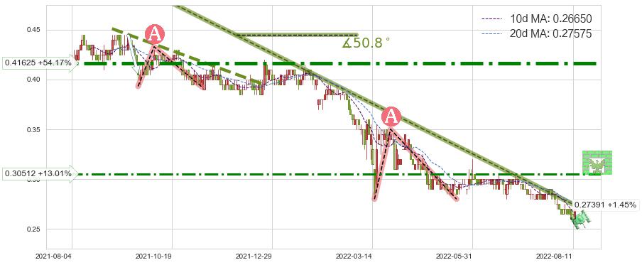 ♘ 阻力价格位0.41625,可信任强度94.95%,距离最后交易2022-08-12形成的收盘价格0.27000相差 +54.17%