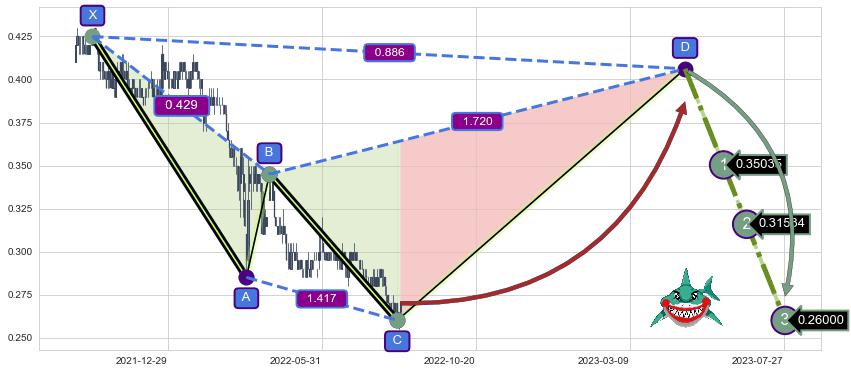 ➣ 未完成【鲨鱼】形态起点X: 2021-10-20, 已到达C点: 2022-08-10, 预测最终D点: 2023-04-28, 共386交易日