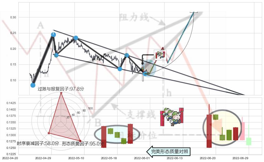 ➣ 中流砥柱形态 + 降楔型临近阻力猜想转换支撑上涨信号叠加后【目标达成率】中等,【看多】信号叠加【存续影响中等】