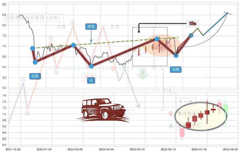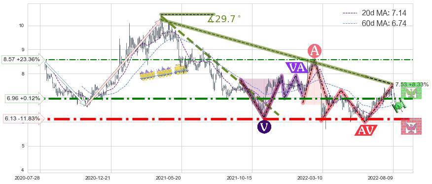 ➢ 【仅预测突破】最后价格:6.95与预测突破价格:7.52→【空间较大】后续最小【反转】第一目标价格→(2022-10-03: 8.60 )
