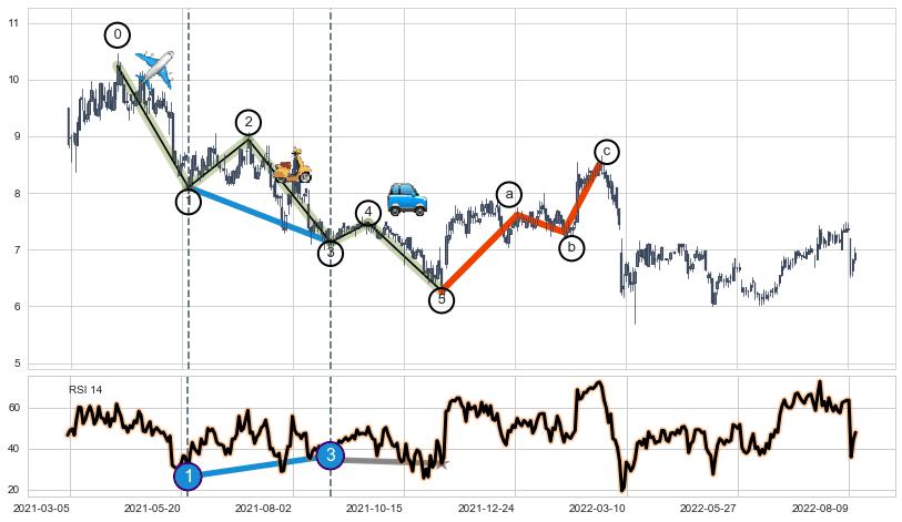 ➢ 第一, 三驱动浪端点:【RSI】走势出现【常规背离 & 反转信号】背离程度51.98%,背离夹角角度85.8˚,背离程度较小