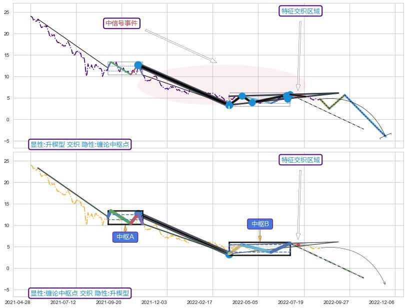 ➣ 缠论中枢点:猜想破位中枢B后持续下拉 → 下跌 → 破位中枢B支撑 → 持续趋势跟踪