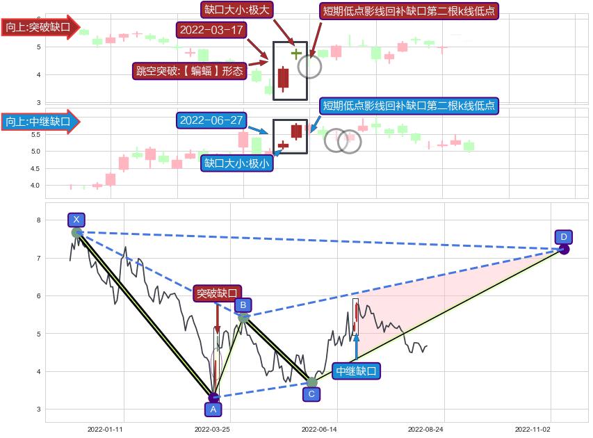 ➣ 突破缺口形成后,后续k已经超过14根,跳空突破【蝙蝠】形态关键点后, 出现【轻微回踩】迹象,短期低点影线回补缺口第二根k线低点