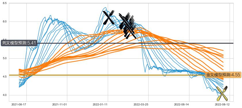 ➣ 80小时均线于(2022-02-23: 5.71)形成【死叉】基于【死叉历史模型】预测死叉后最低波谷价格: 5.19, 死叉后最低价格3.860,已经下跌超出预测最低波谷价格, 预期反弹