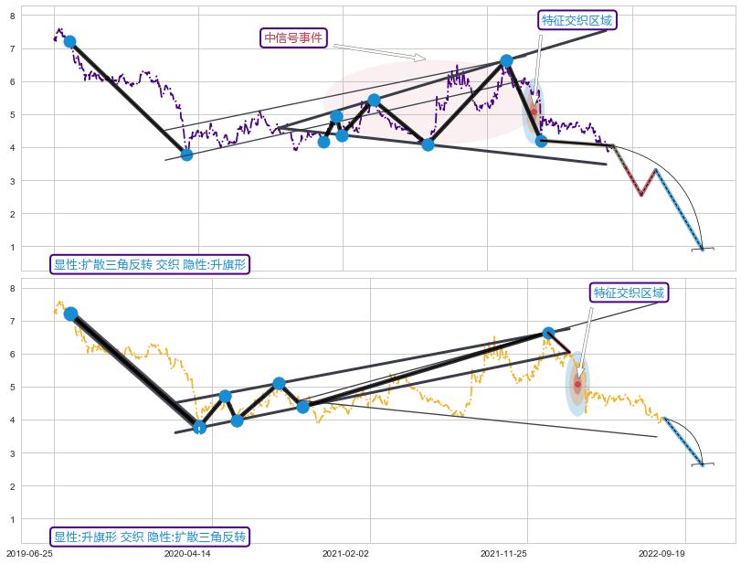 ➣ 扩散三角反转:猜想临近关键支撑位突破点 → 临近拐点下跌 → 风险信号 → 大趋势均值回复