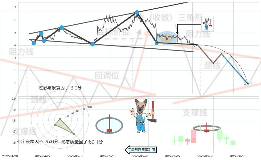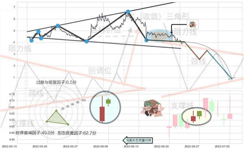 ➣ 【多空双方观望→争持→促使价格波动日益狭窄→空方打破攻守平衡点】对称三角形中继整理, 已在2022-07-06突破【支撑】颈线 4.47 →演变成下降通道