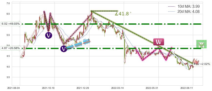 🦴 长线均值回复组合短线趋势跟踪[强阻力信号]2022-01-03-2022-08-11下跌趋势依然成立(下跌趋势跟踪依然存在),短线价格略微上行反弹(均值回复猜想),即将接近下跌趋势提供的未破位阻力价格:4.12。
