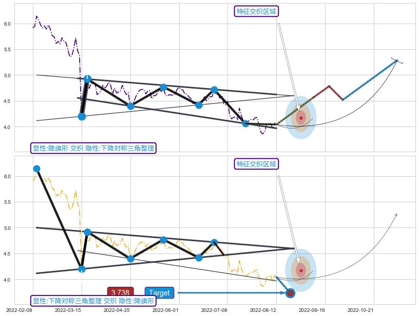 ➢ 下降对称三角整理:猜想预期下跌目标target即将达成,随后猜想强支撑来临,预期反弹上涨(均值回复)